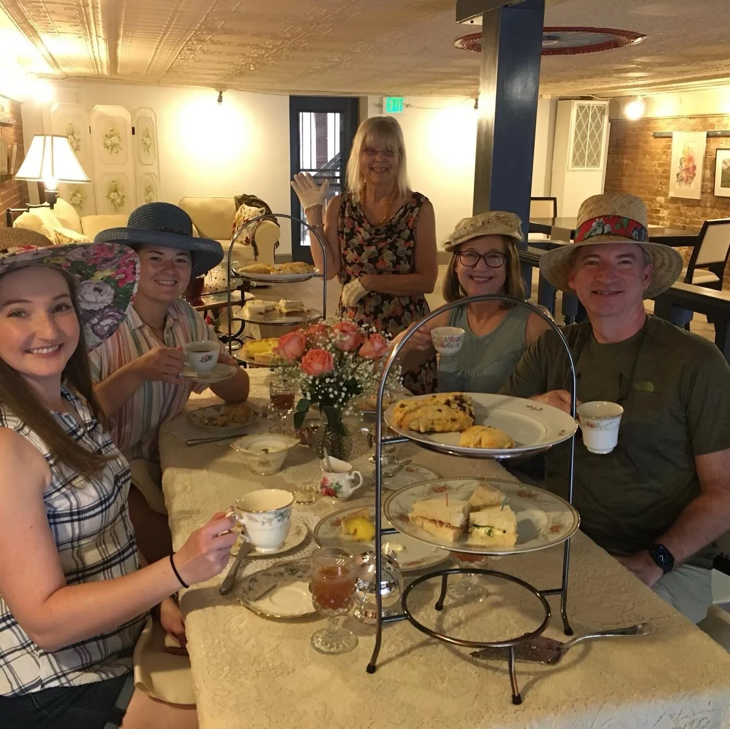 It was a midsummer afternoon at the end of July at Create Art and Tea, on Main Ave in Durango Colorado, the breeze softly blew through the open door as the excited guests arrived. As you stepped off the bustling sidewalk and into the inviting gallery, the aroma of tea and pastries filled the air. You were greeted with a warm welcome and a choice of a fancy hat (if you didn’t bring your own). Guests made their way up the stairs to the loft, where a table was beautifully set. The sandwiches and pastries were made by, local chef, Amoun Kirk. The tea was brewed, in-house, by Caprice Fox, the owner of the gallery, and the hostess of this event. The small, intimate group Gathered around the table to enjoy the spread, each other’s company, and of course, tea. Sounds of laughter and light-hearted conversation trickled down to the lower half of the gallery as curious customers gazed up at the group above. It truly was the perfect afternoon for High Tea.